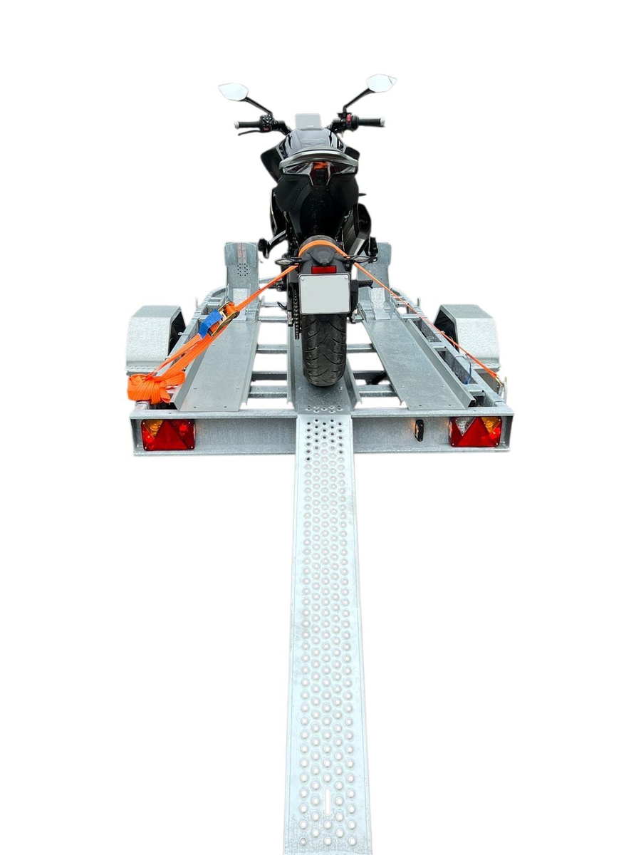 Одноосный прицеп без тормоза ЛАВ-81012 Мото предназначен для перевозки двух мотоциклов одновременно, оснащён направляющими для установки мотоциклов и фиксатором переднего колеса (с шириной фиксирующей "лапы" 90 или 120 мм на выбор) для каждого мотоцикла. Для обеспечения оптимальной нагрузки на сцепной шар, подвеска может быть смещена вперед или назад в зависимости от положения центра тяжести перевозимого груза. Перемещаемые по раме петли крепления груза позволяют надёжно закрепить грузовыми ремнями груз при перевозке. Трап для заезда входит в стандартную комплектацию, при перевозке размещается в передней части рамы прицепа.