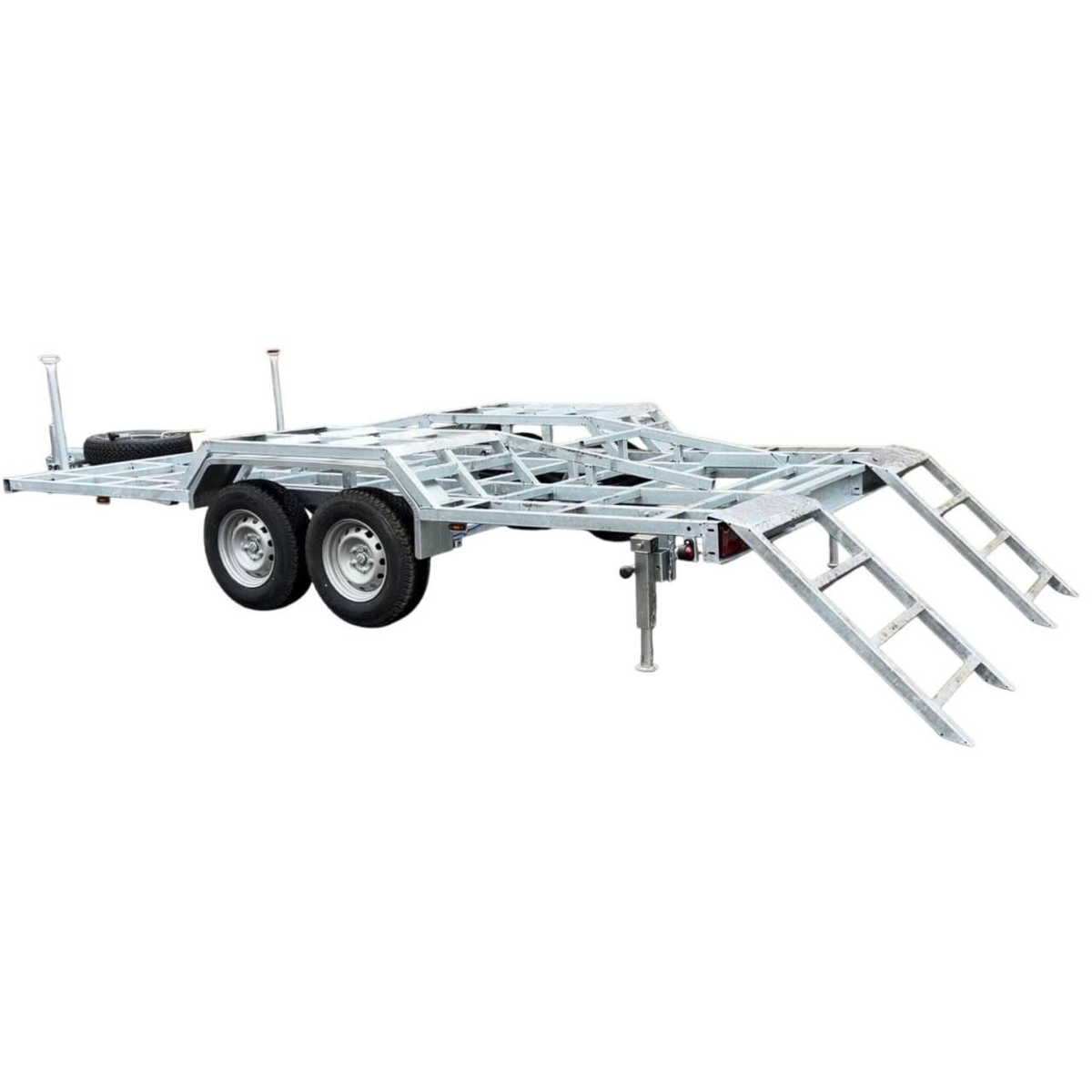 Двухосный прицеп оснащённый тормозом ЛАВ-81022В Болотоход предназначен для перевозки Вездеходов - болотоходов. Рама прицепа сварная из труб и профилей, оцинкованная "горячим способом". Рессоры 2-х листовые переменного сечения. Трапы для заезда; Опорные стойки на задней части рамы прицепа- поворотные, передние - подъёмные; предотвращающие опрокидывание прицепа, при заезде техники, входят в стандартную комплектацию.
