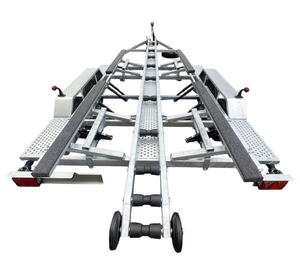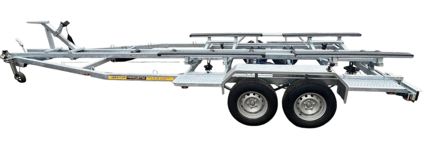 Рама, оси прицепа полностью оцинкованы методом горячего цинкования. Крылья выполнены из оцинкованной стали. Прицеп двухосный, с тормозом наката. Подвеска колес (R14) на четырёх полуэллиптических рессорах с гидравлическими амортизаторами (8шт). Оснащен 4-мя домкратами с качающимися спаренными колесами для установки лодки. Оборудован выдвигающимися (до 1000 мм) штангами с фонарями. Сцепное устройство шарового типа, под шар D 50 мм. Возможен вариант исполнения со сцепным устройством "петля НАТО" диаметром 76 мм. Полная масса 3000 кг. Грузоподъёмность 2200 кг. Габаритные размеры, мм - длина 7800; - ширина 2350; - высота 1430. Опорное колесо, носовой упор с установленной на нём ручной лебёдкой, кронштейн для "запаски", запасное колесо - в стандартной комплектации. Категория "Е" обязательна.