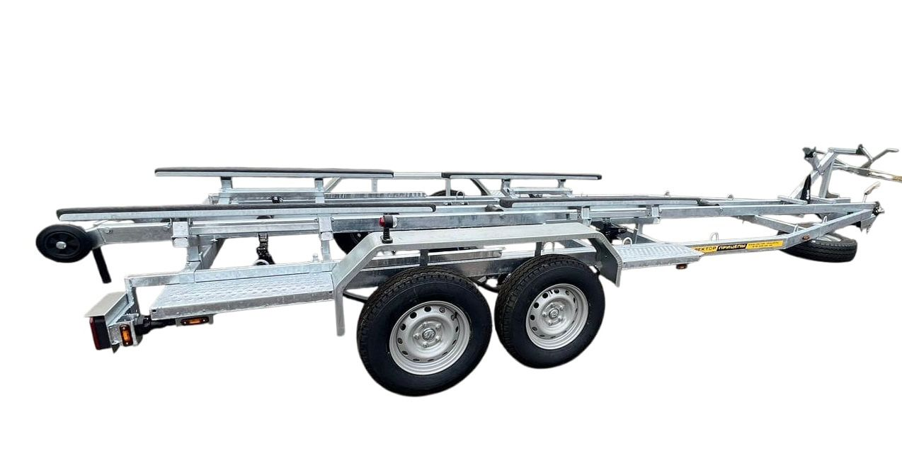 Легковой прицеп для перевозки лодки и для перевозки катера. Прицеп двухосный с тормозом наката, максимальная длинна плавательного средства 8 м., грузоподъемность - 2200 кг.